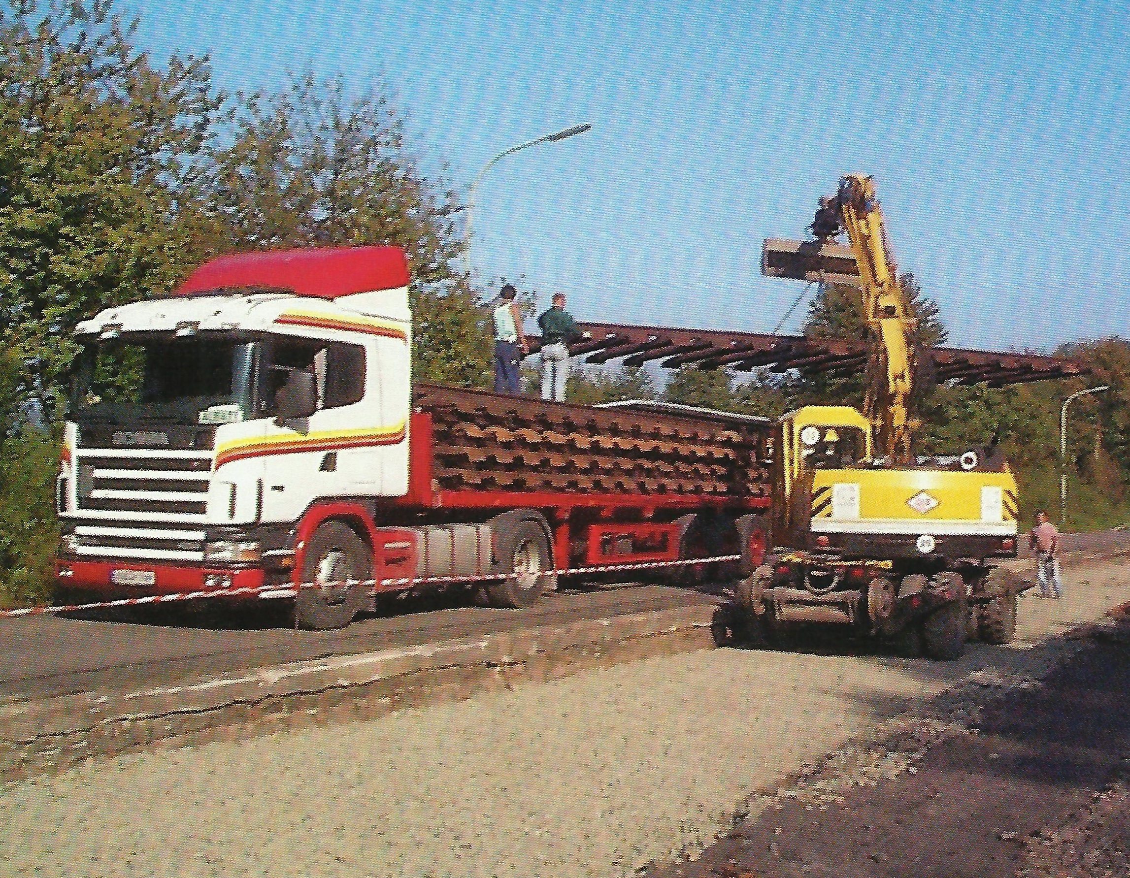 Abladen von Gleisjochen für den Aufbau der Gleise 4, 5 und 6 im Bahnhof Schwarzerden